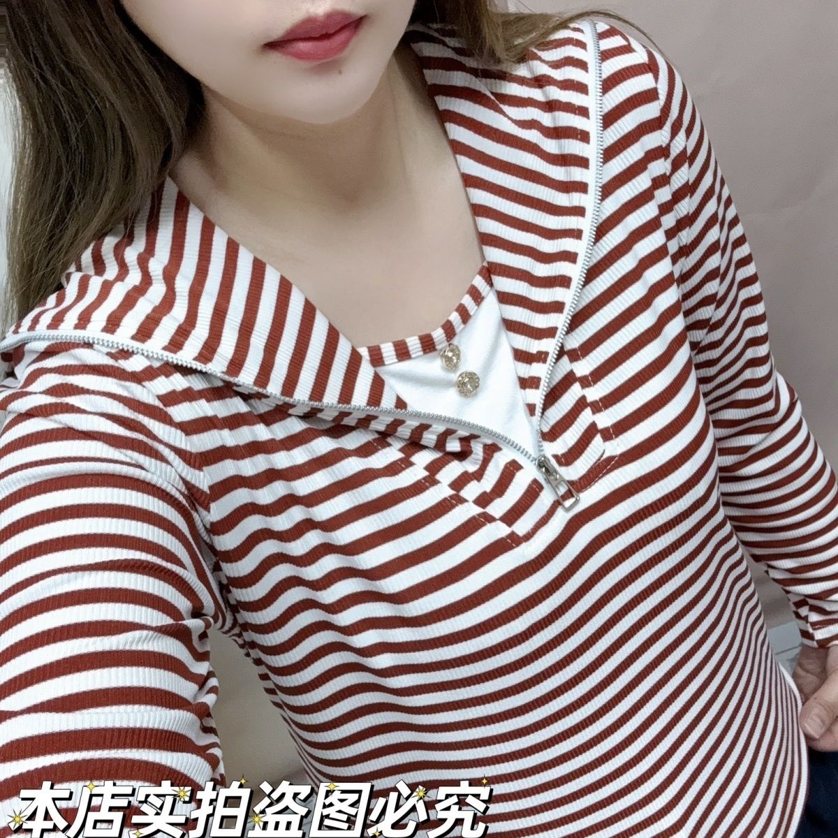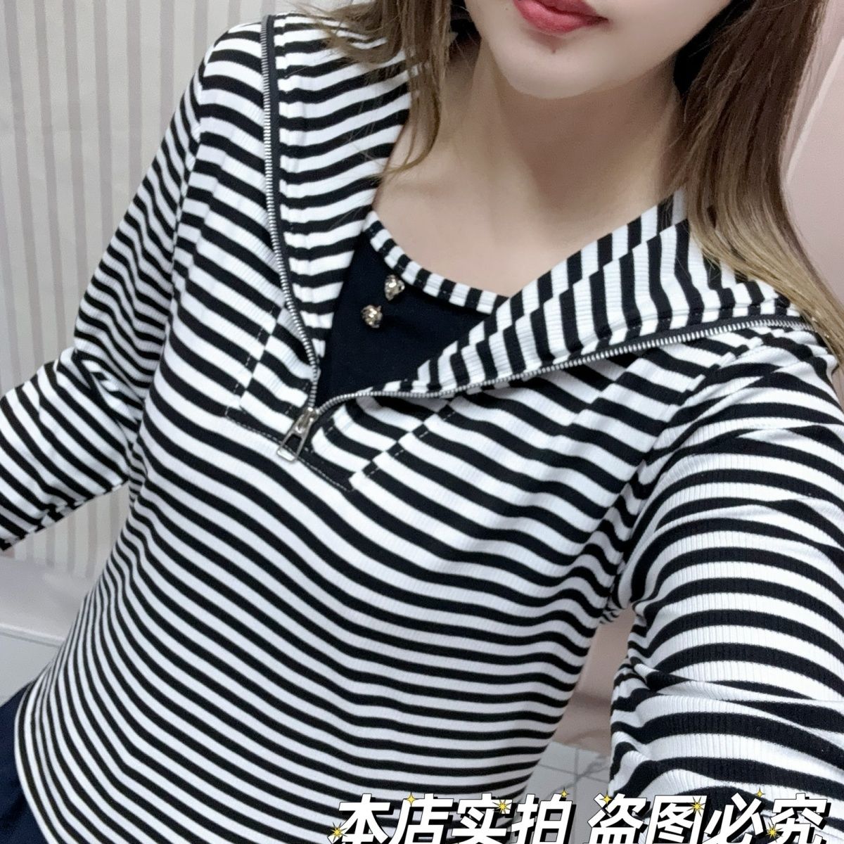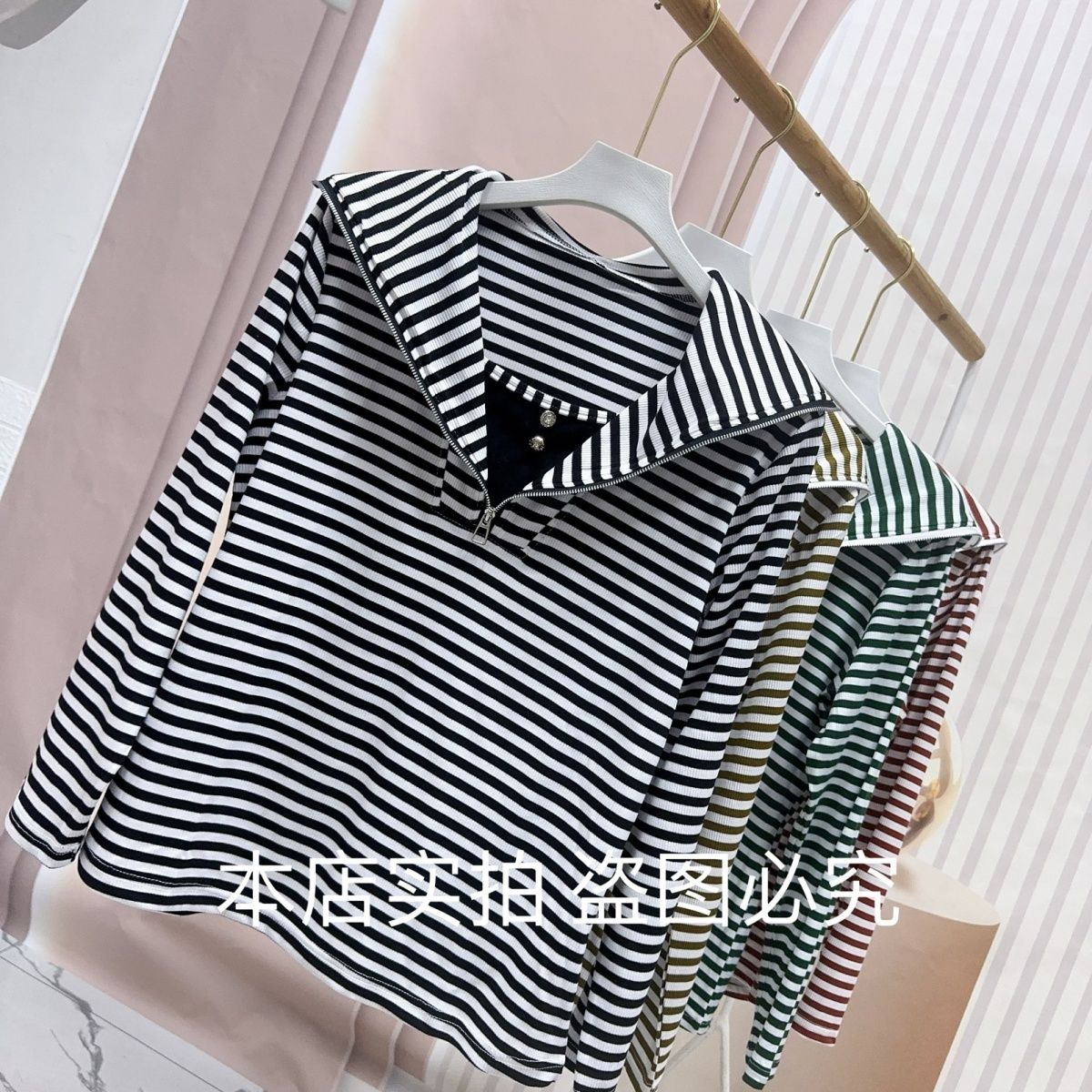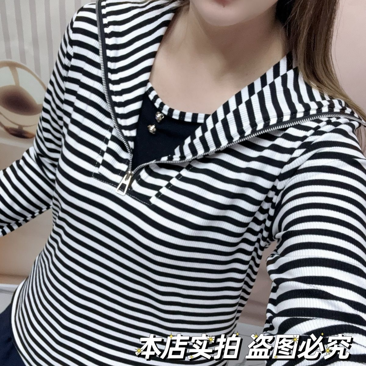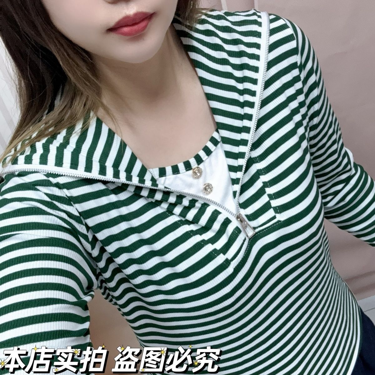海军显瘦时尚修身条纹2025拼接长袖初秋新款减龄上衣T恤洋气小衫
