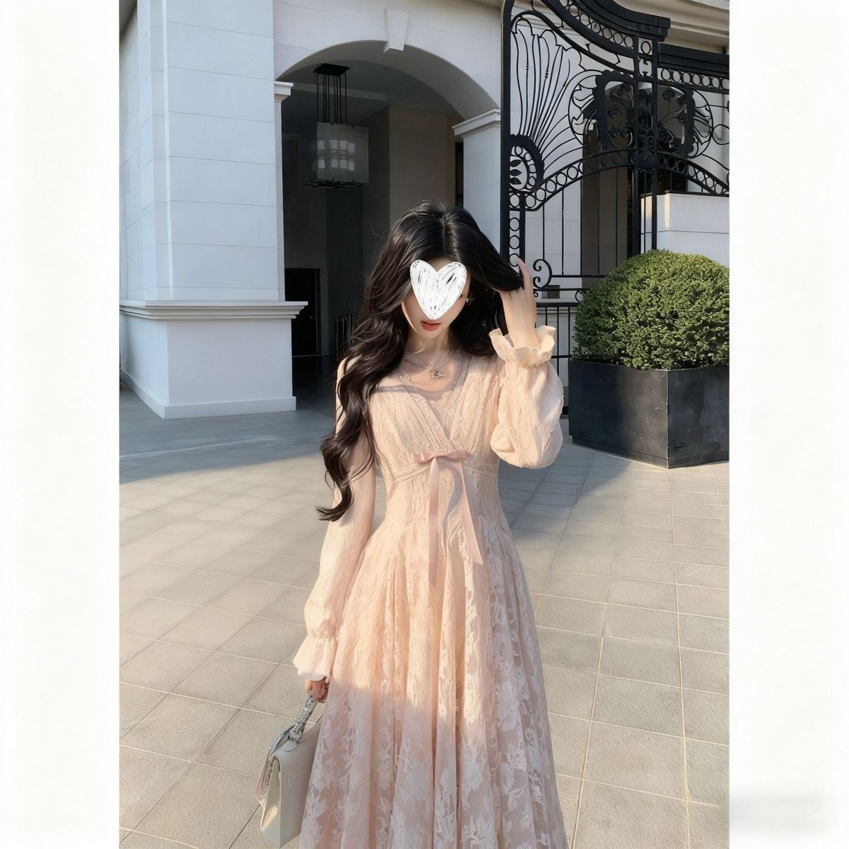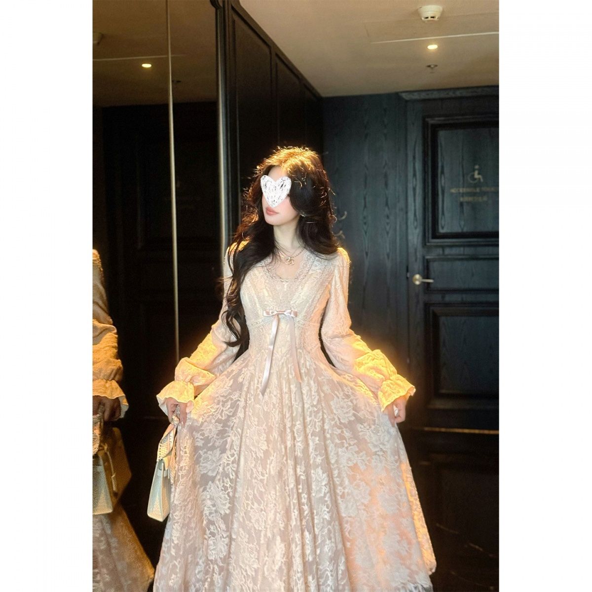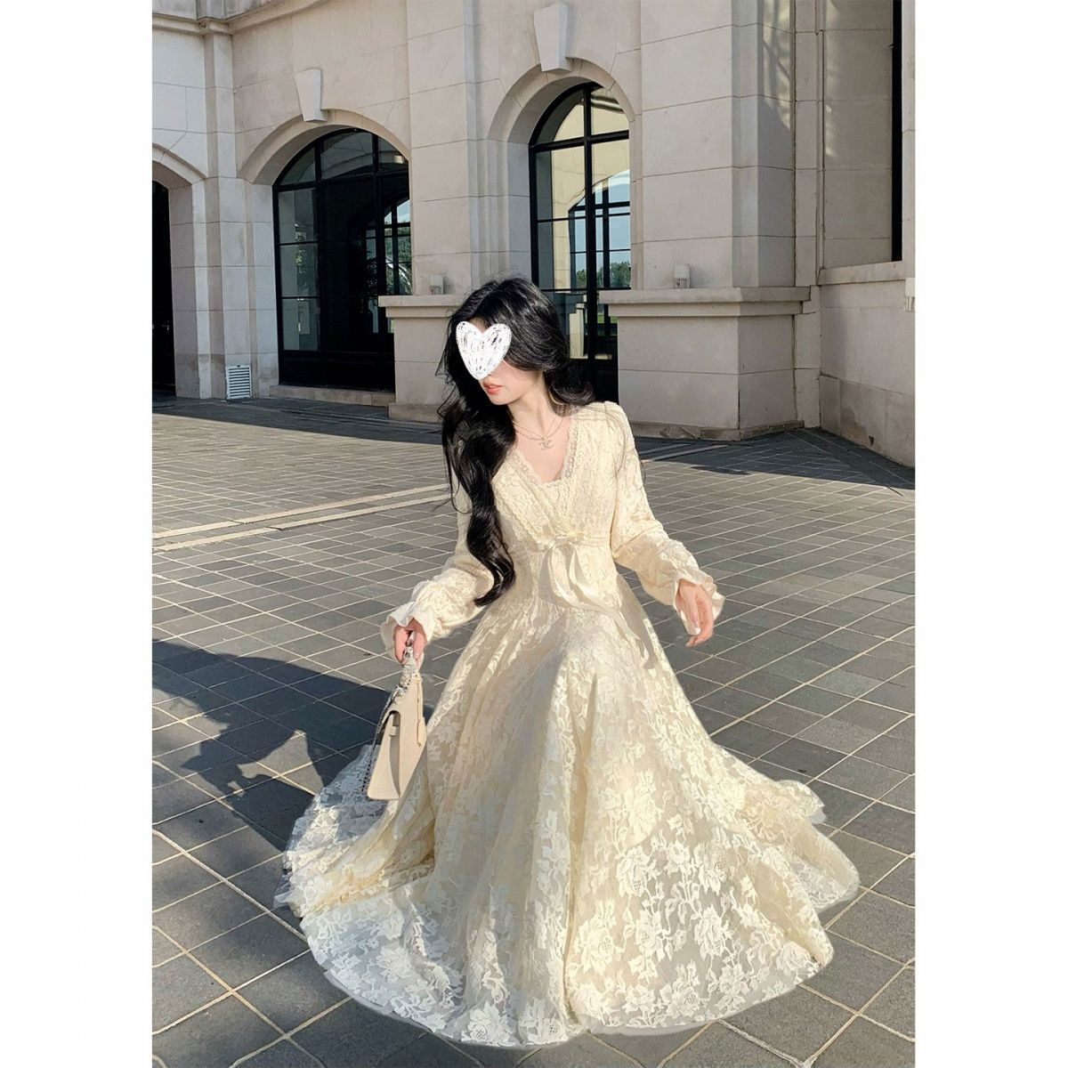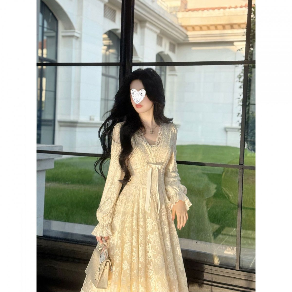 迷迭花园 法式纯欲v领蕾丝连衣裙收腰千金风蓬蓬裙