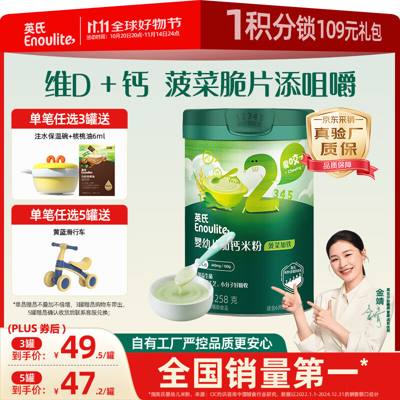 英氏婴幼儿米粉菠菜加铁加钙258g宝宝辅食钙铁锌营养米糊2阶7月+