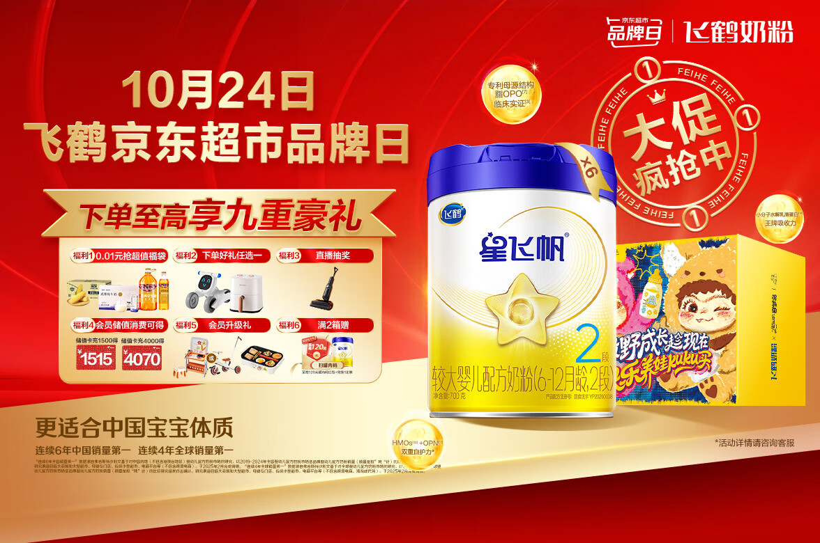 飞鹤星飞帆 婴幼儿配方奶粉 2段(6-12个月)700g*6 专利OPO 育儿补贴