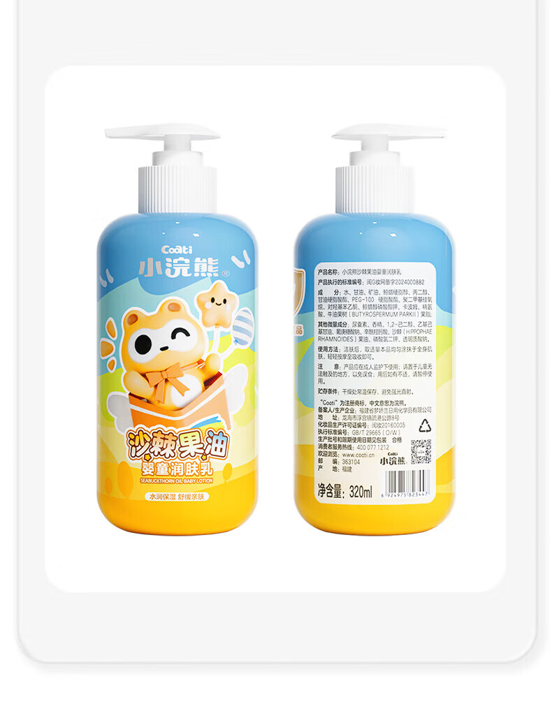 小浣熊沙棘果油婴童润肤乳男孩女孩宝宝护肤320ml大容量 沙棘果油婴童润肤乳320ml*2瓶