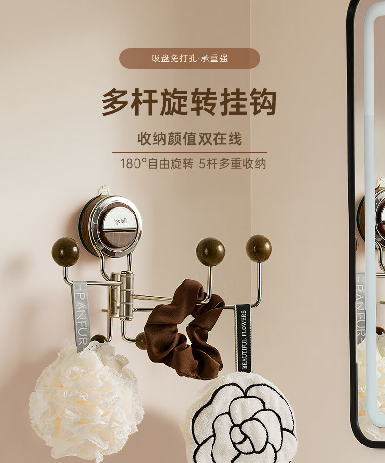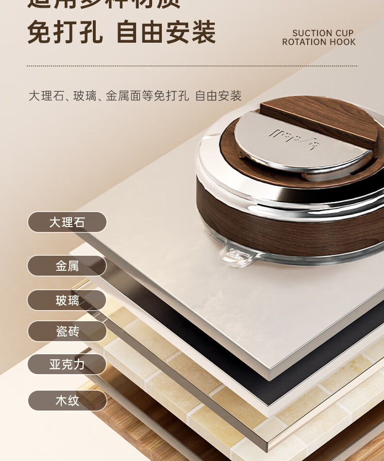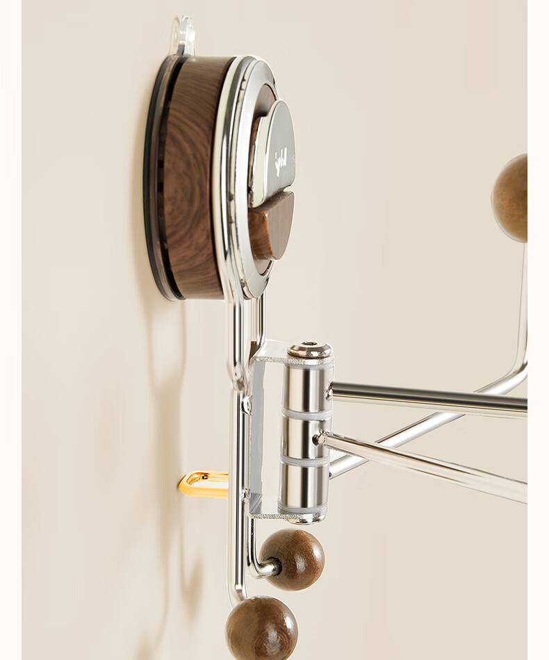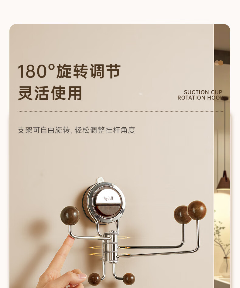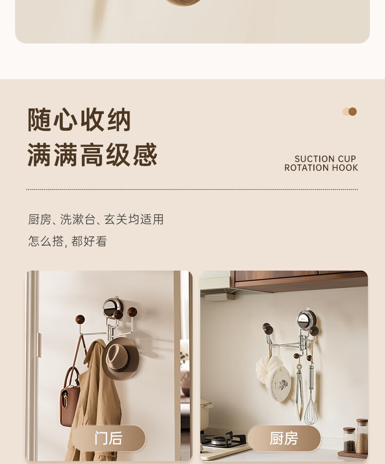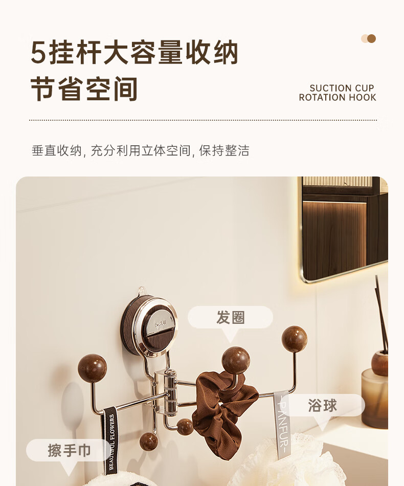 妃驰高颜值浴室吸盘旋转挂钩卫生间门后厨房免打孔真空无痕毛巾衣服钩 胡桃木色-吸盘挂钩【可旋转】