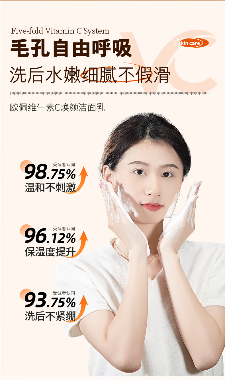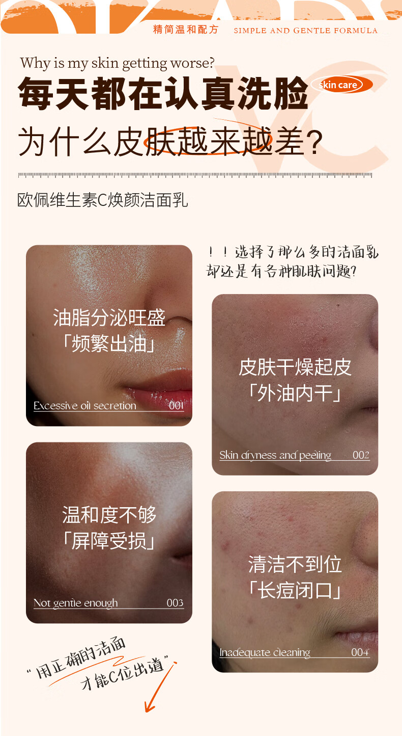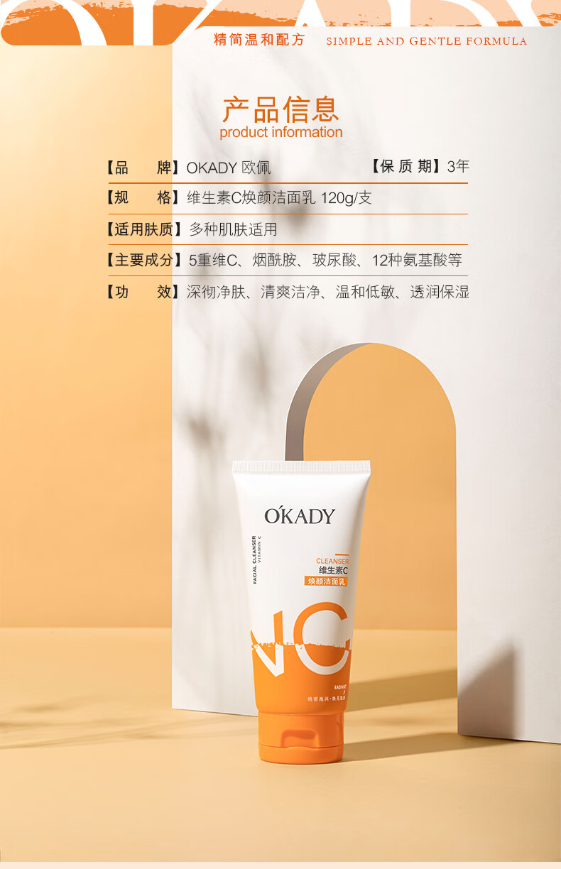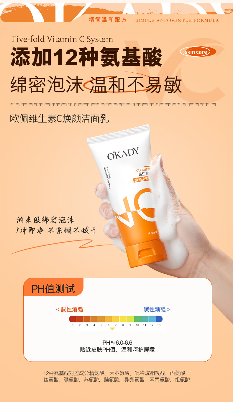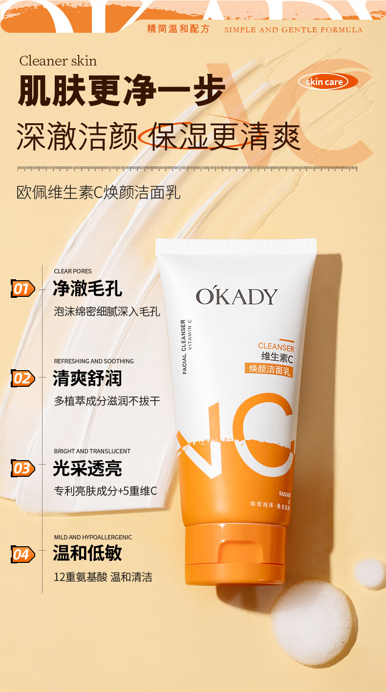 欧佩(O'KADY)维生素C焕颜洁面乳温和控油清洁洗面奶深层收缩毛孔提亮肤色男女 120g