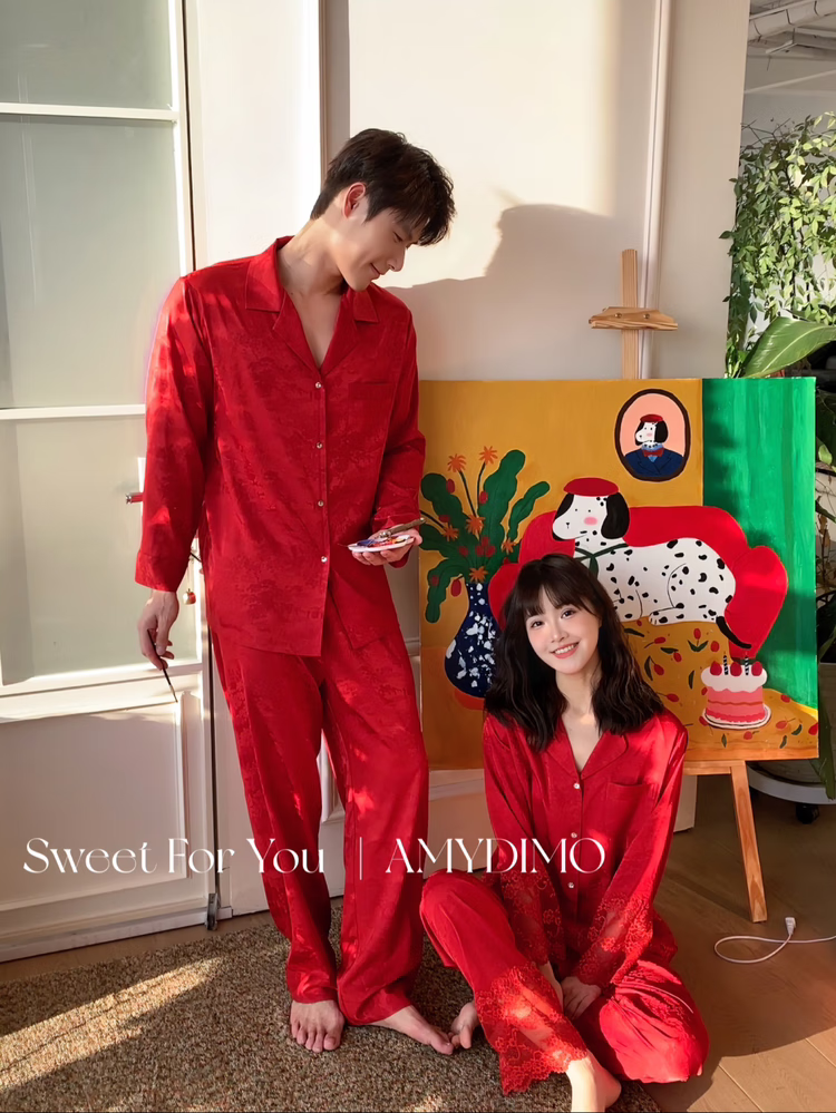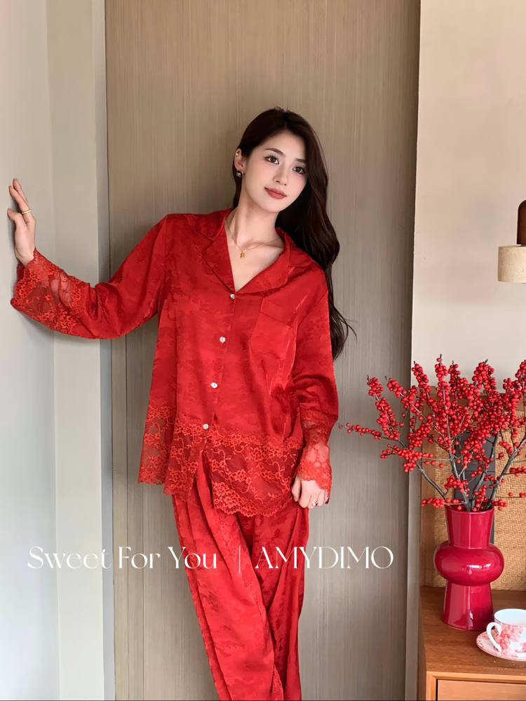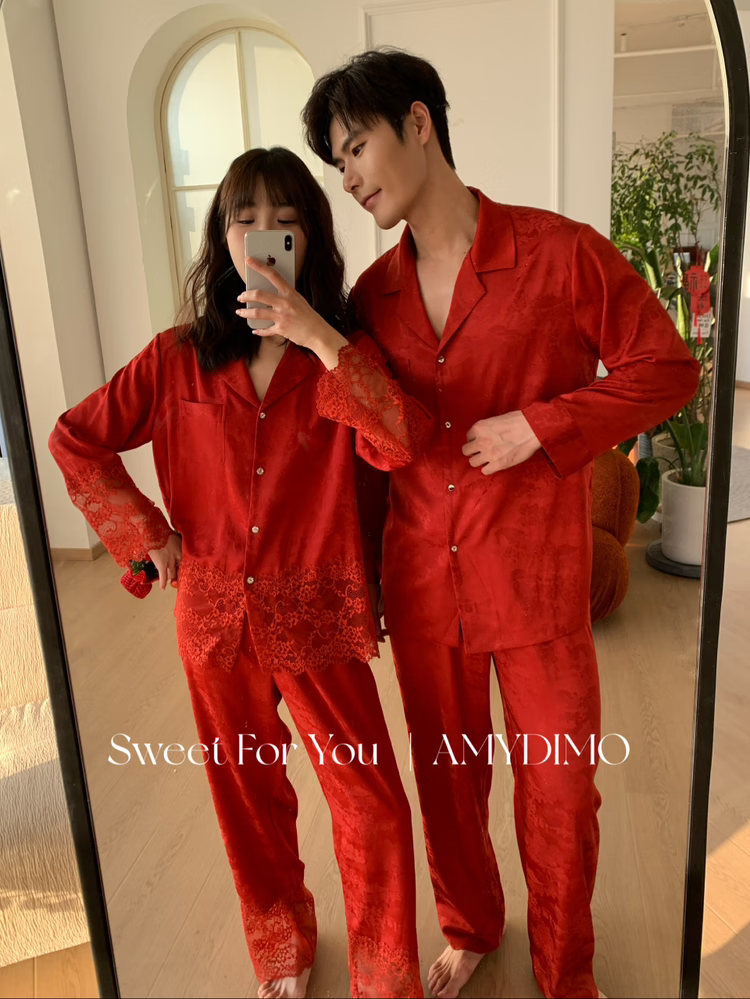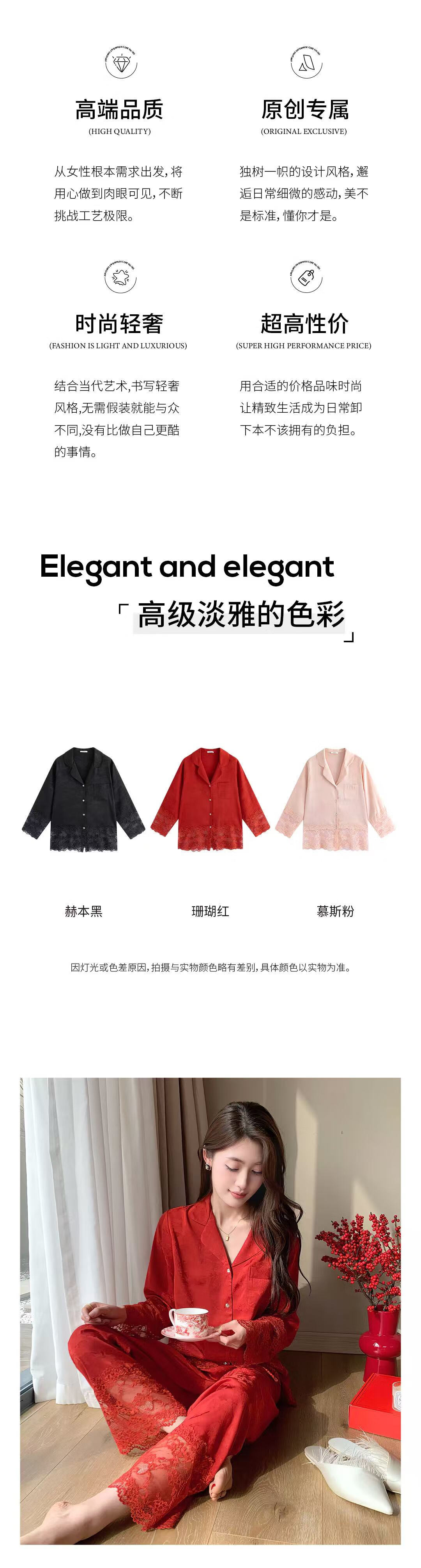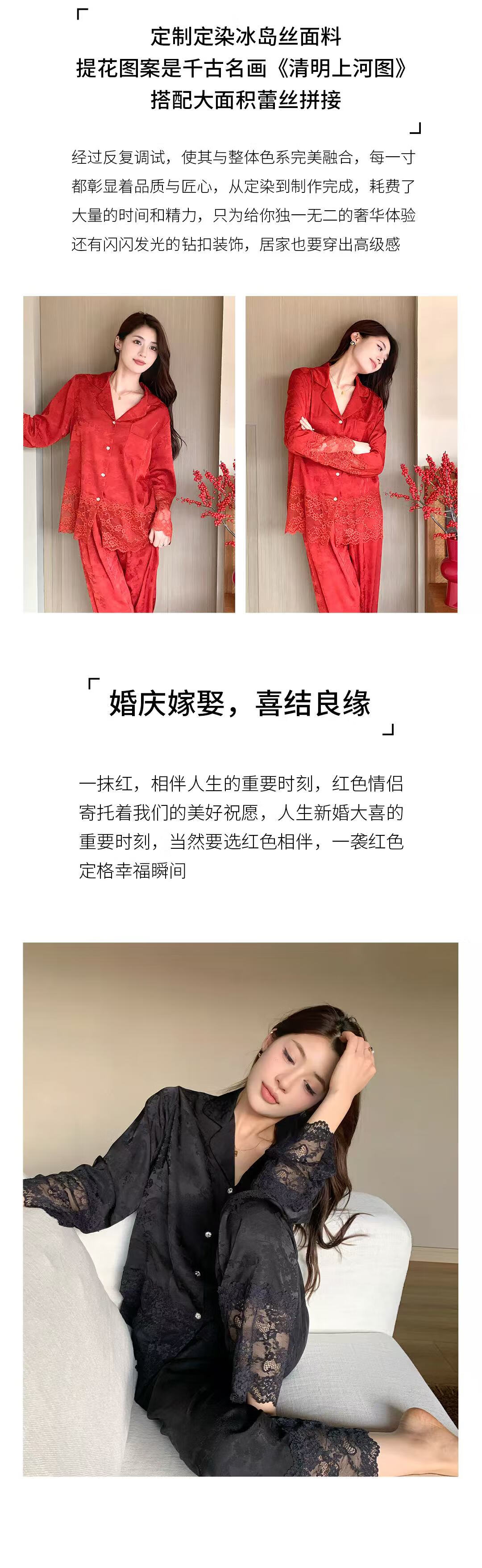 艾缇贝丽amydimo红色结婚情侣睡衣长袖长裤蕾丝黑色家居服 红色-女款 M