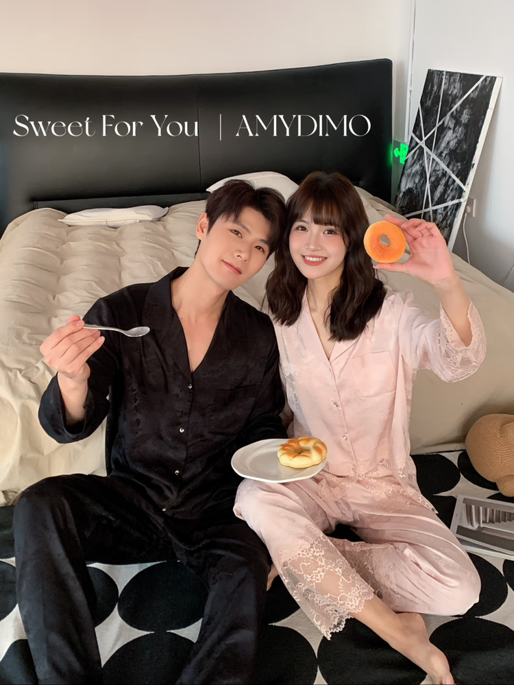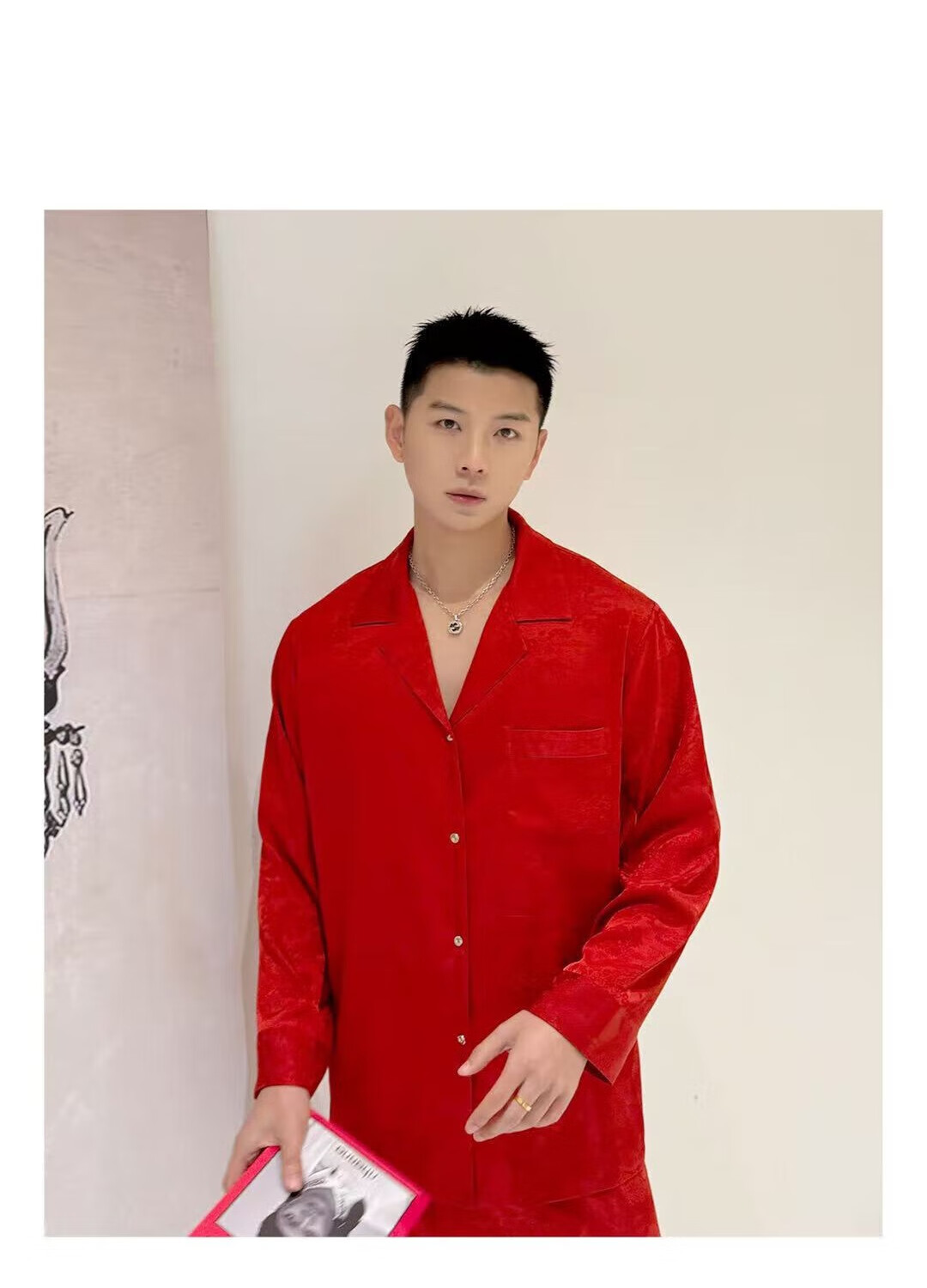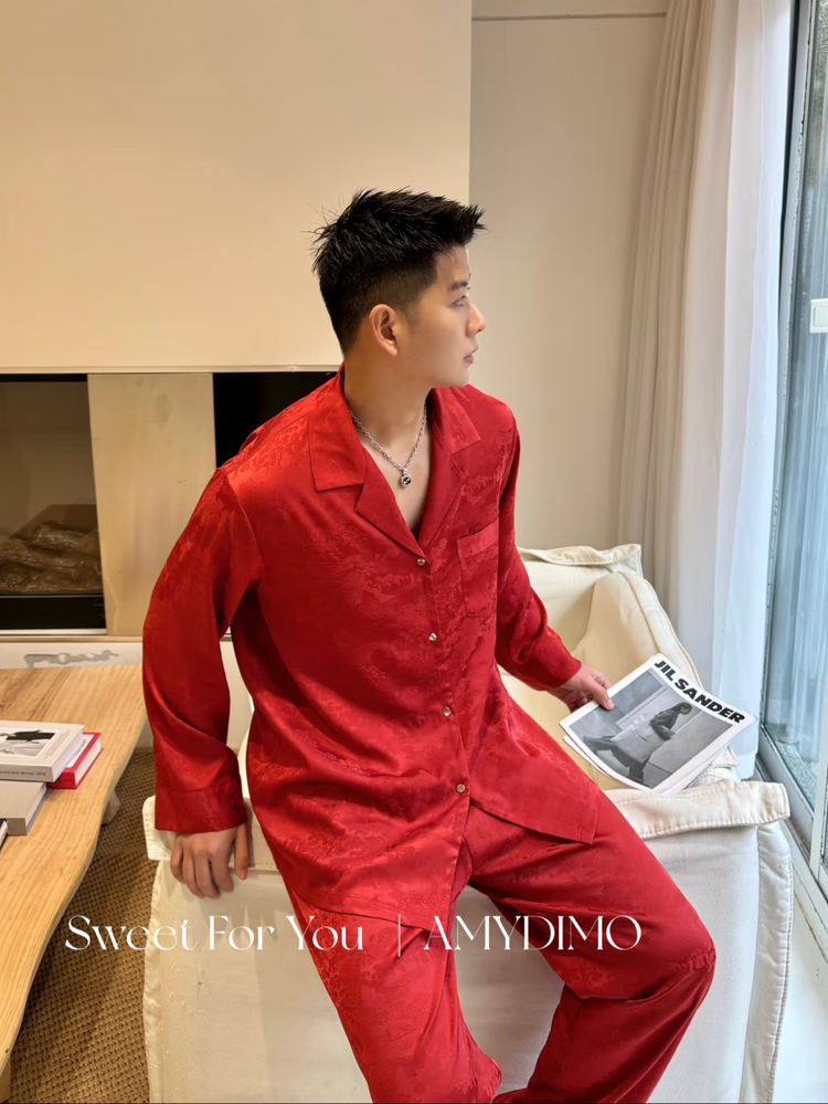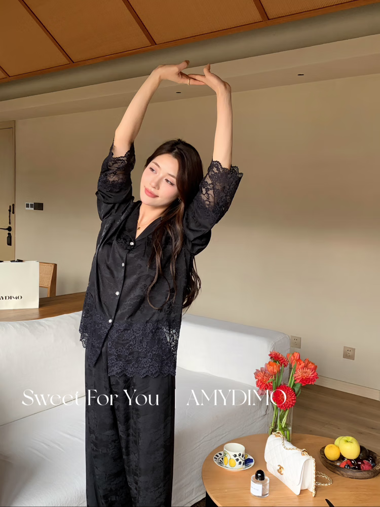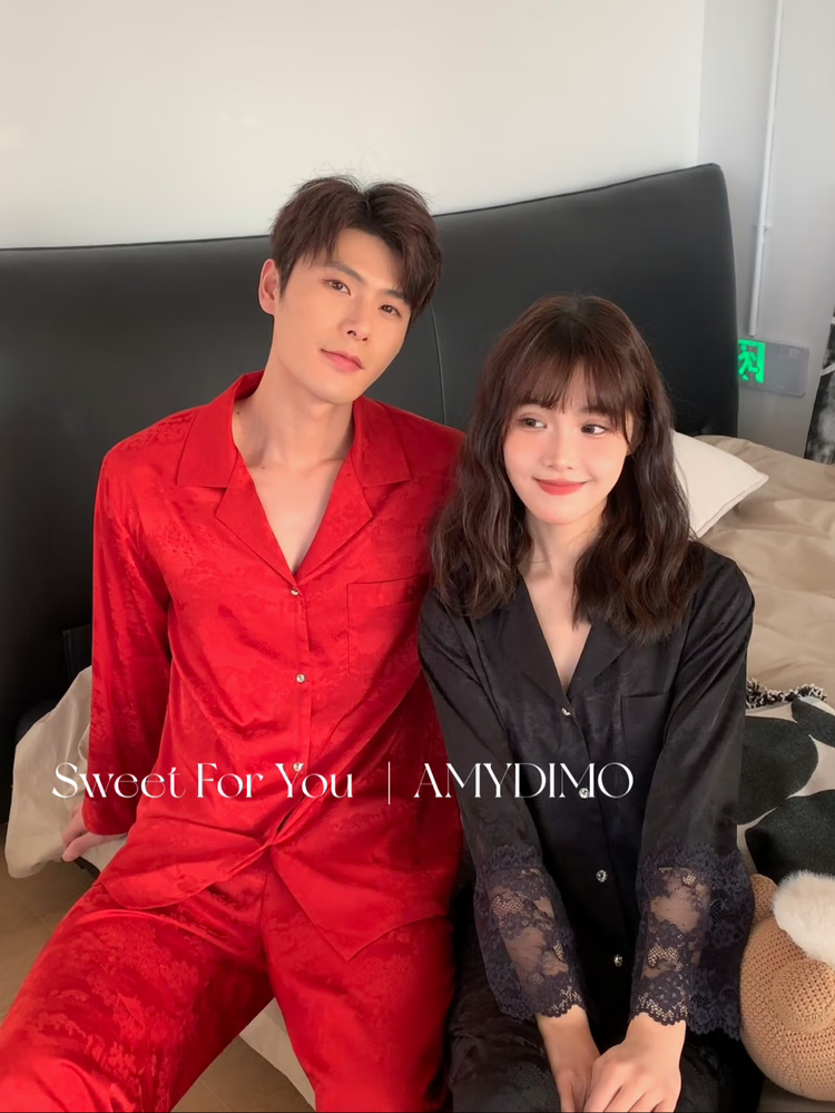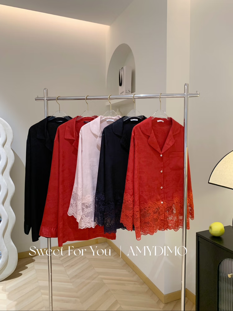 艾缇贝丽amydimo红色结婚情侣睡衣长袖长裤蕾丝黑色家居服 红色-女款 M