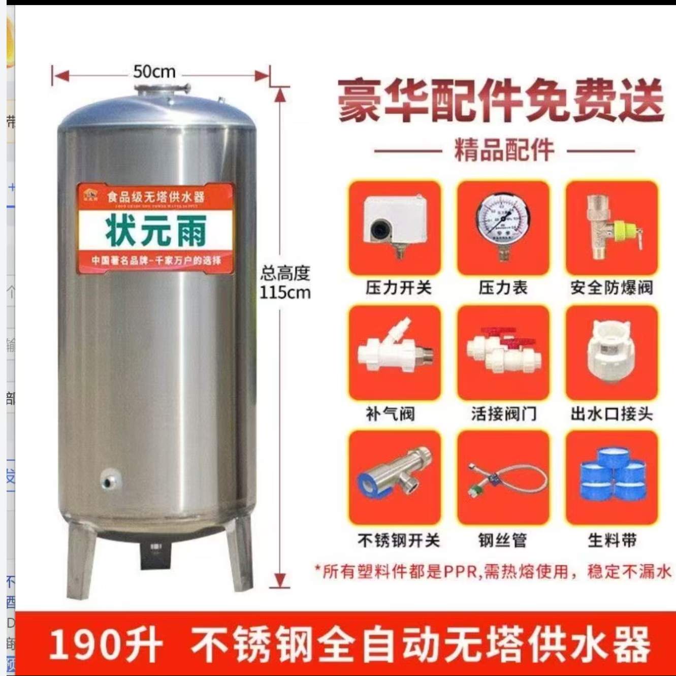 状元雨状元雨304不锈钢压力罐储水罐水塔家用全自动上水控制增压泵蓄水 加厚265升不锈钢50*155不带口