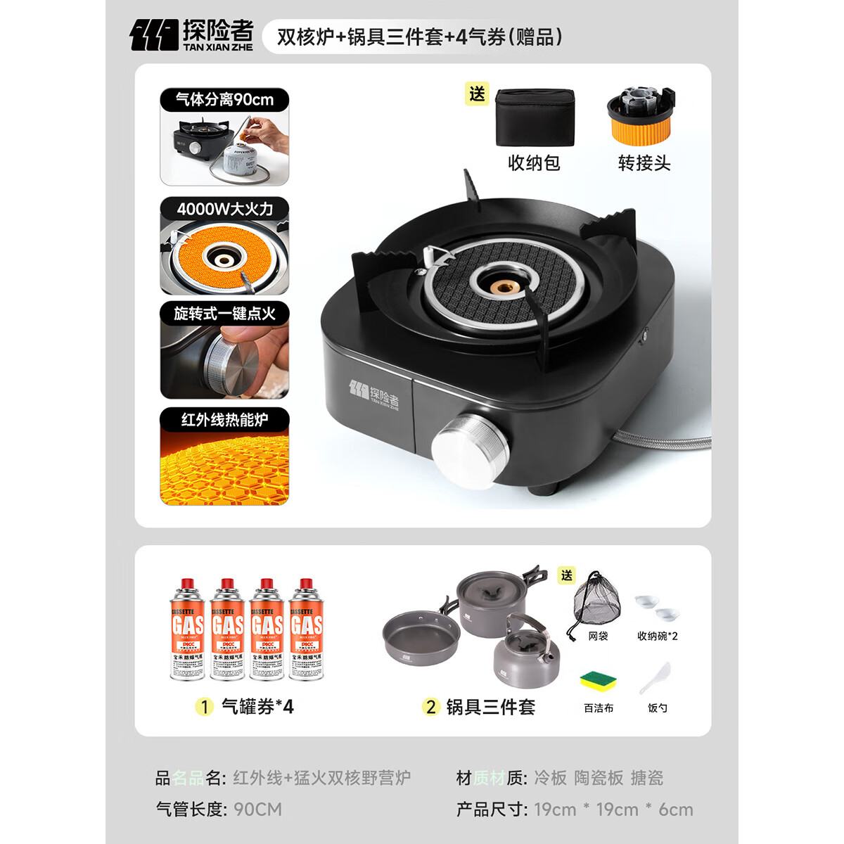 探险者(TAN XIAN ZHE)卡式炉分体式户外炉具卡磁炉防爆红外线猛火便携野餐露营装备全套 双核炉+锅具三件+4气券(赠品)