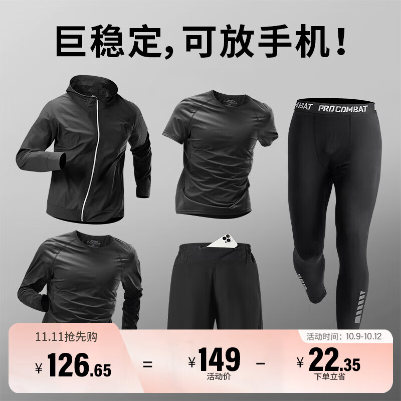 艾伦伯顿(Alen Botun)健身服男跑步运动套装篮球秋季速干衣高弹训练晨跑服紧身足球衣服 升级五件套黑色【后腰口袋】 XL(145-165)斤