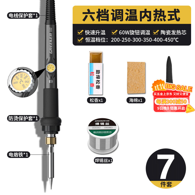 绿林(GREENER)电烙铁家用60W内热式可调温铬铁洛铁锡焊神器电焊笔套装7件套