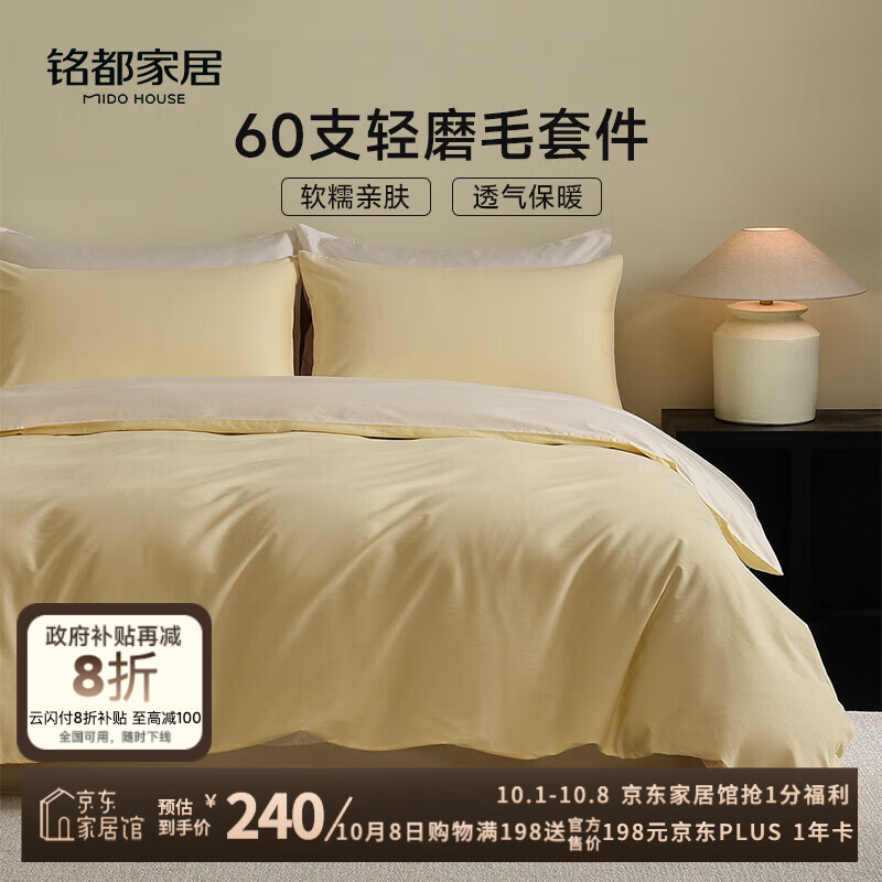 MIDO HOUSE铭都床上四件套60支纯棉四季磨毛床单被套嫩鹅黄1.8m床单款