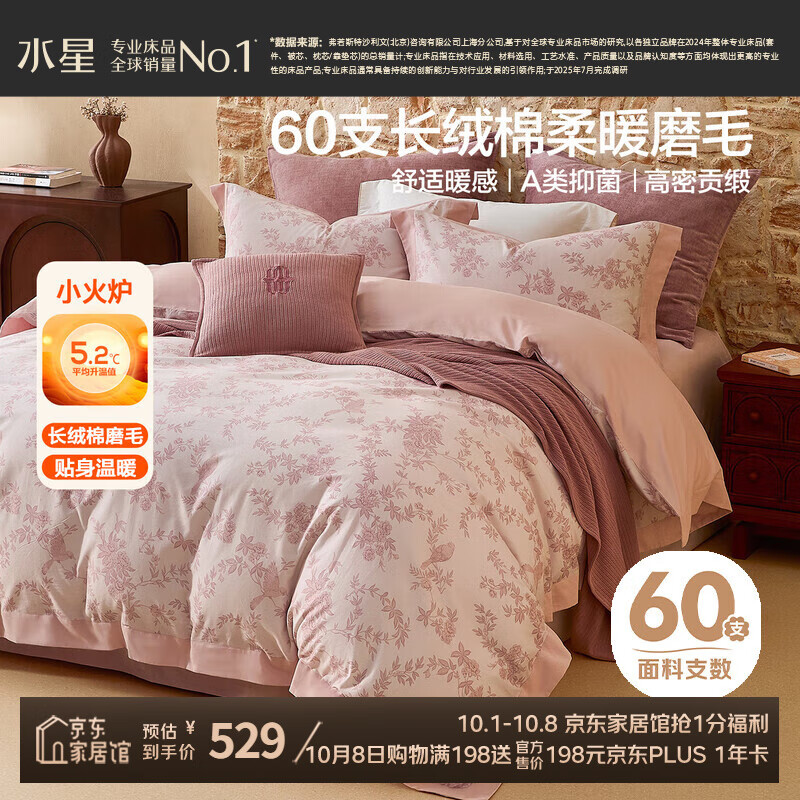 水星家纺磨毛四件套60支长绒棉床上纯棉100%a类全棉床单被套冬天保暖双人1.8m床花栖