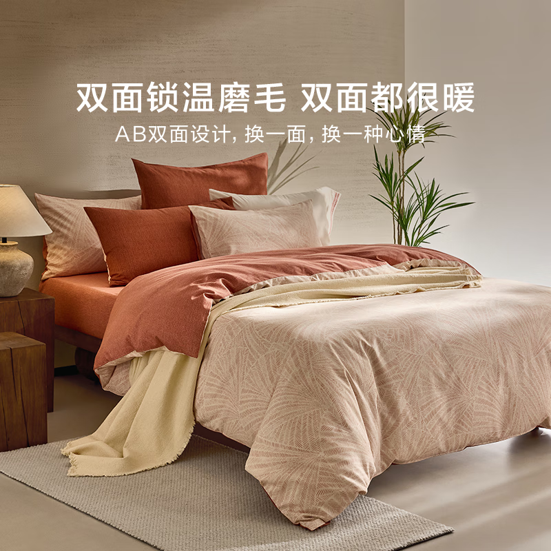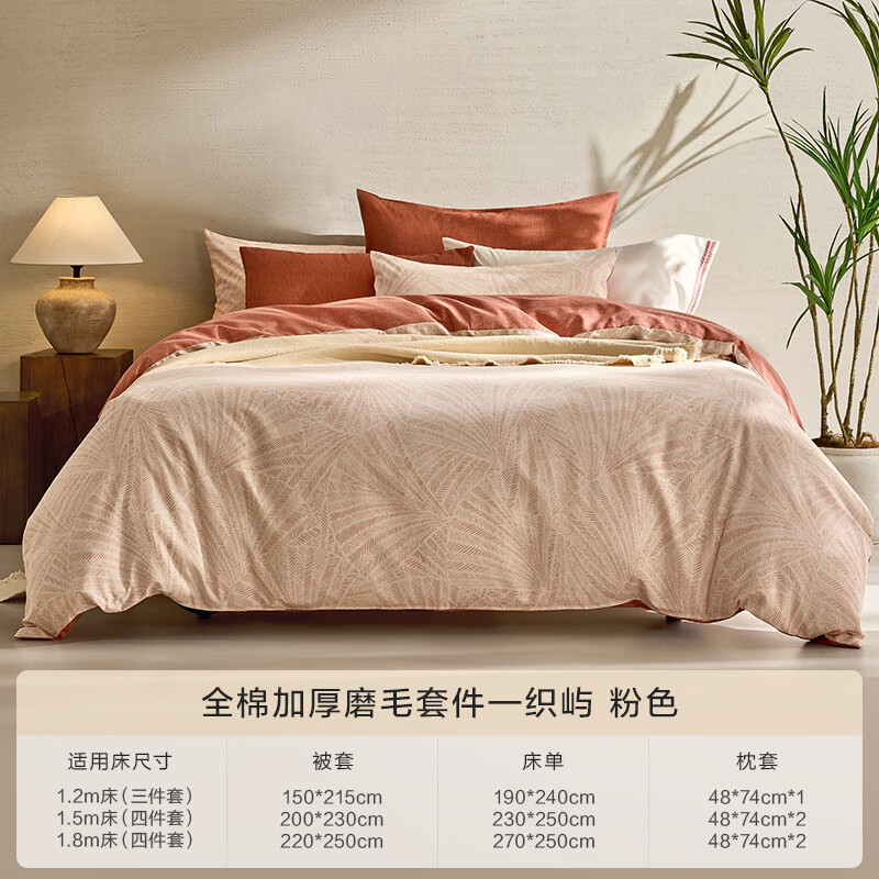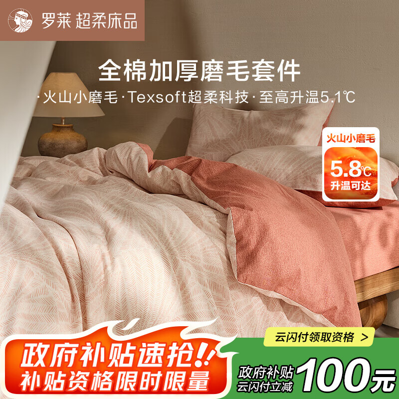 罗莱家纺全棉加厚磨毛四件套冬季纯棉被套床单被罩 粉色220*250