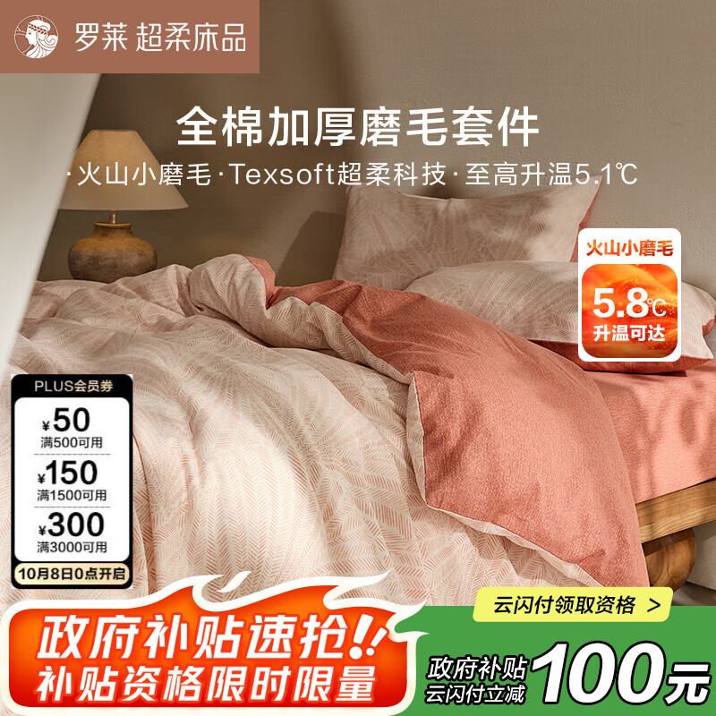 罗莱家纺全棉加厚磨毛四件套冬季纯棉被套床单被罩 粉色220*250