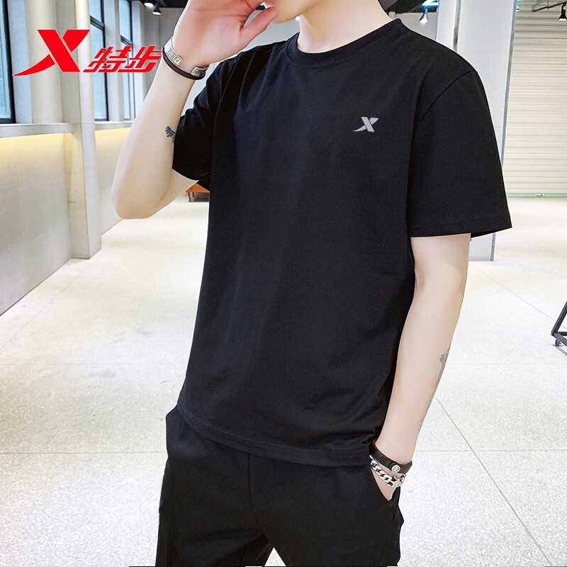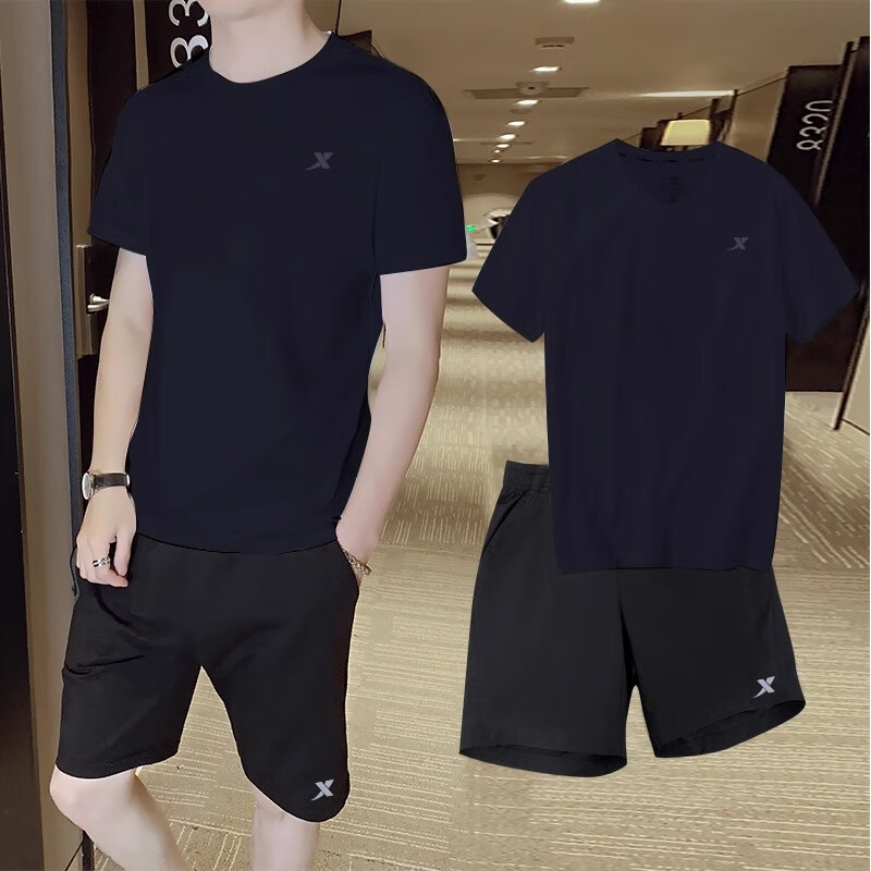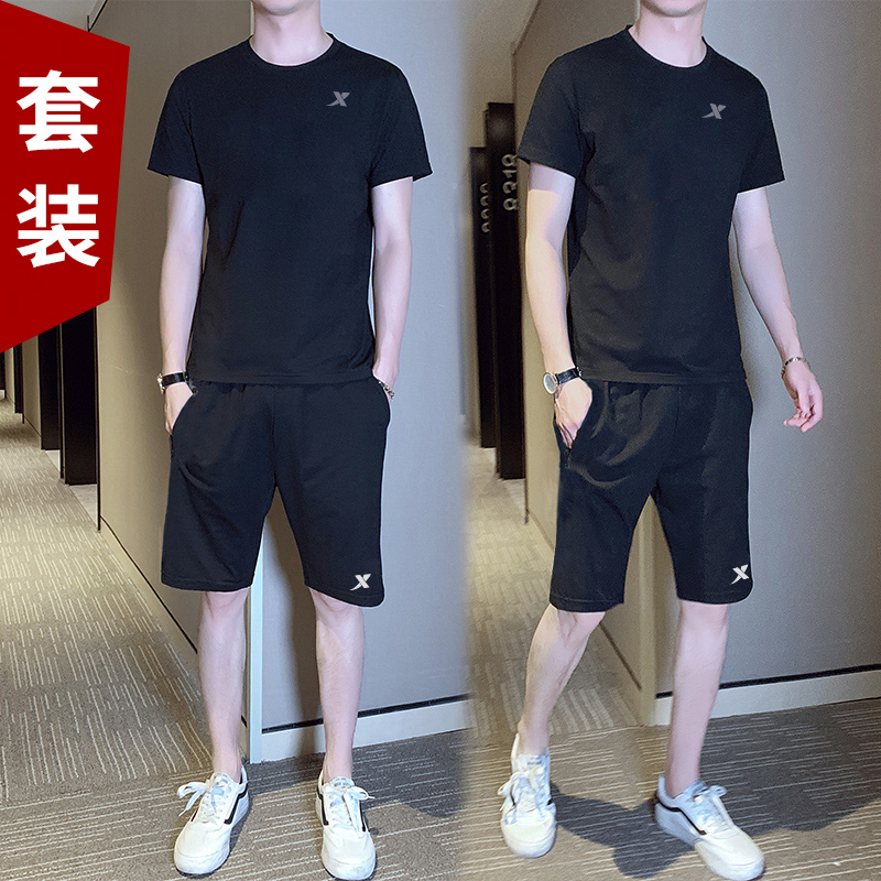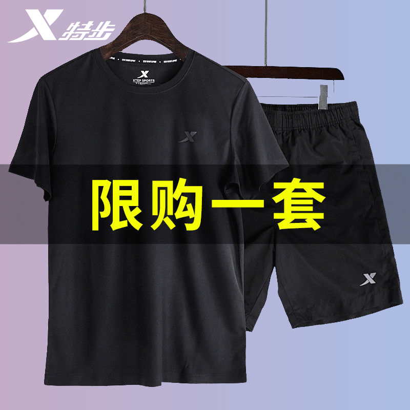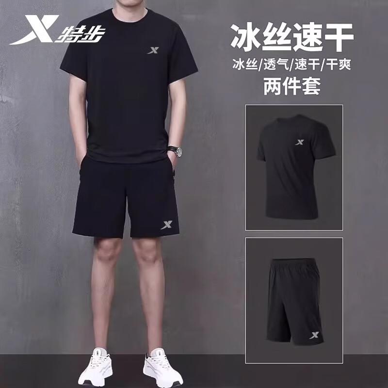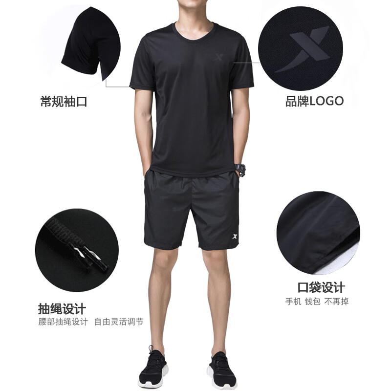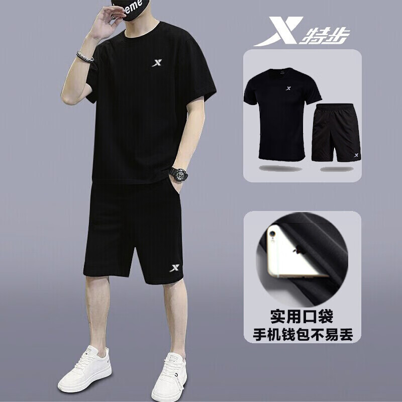 特步运动套装男士夏季透气冰丝速干户外运动服宽松休闲短袖t恤短裤男 【有口袋】套装-黑色 M/170