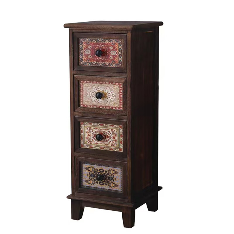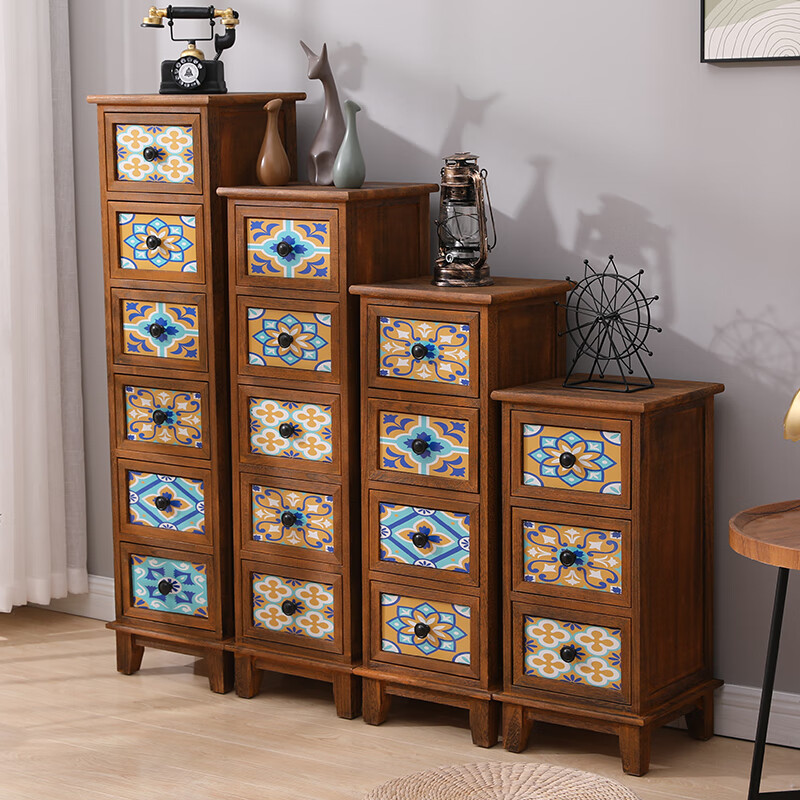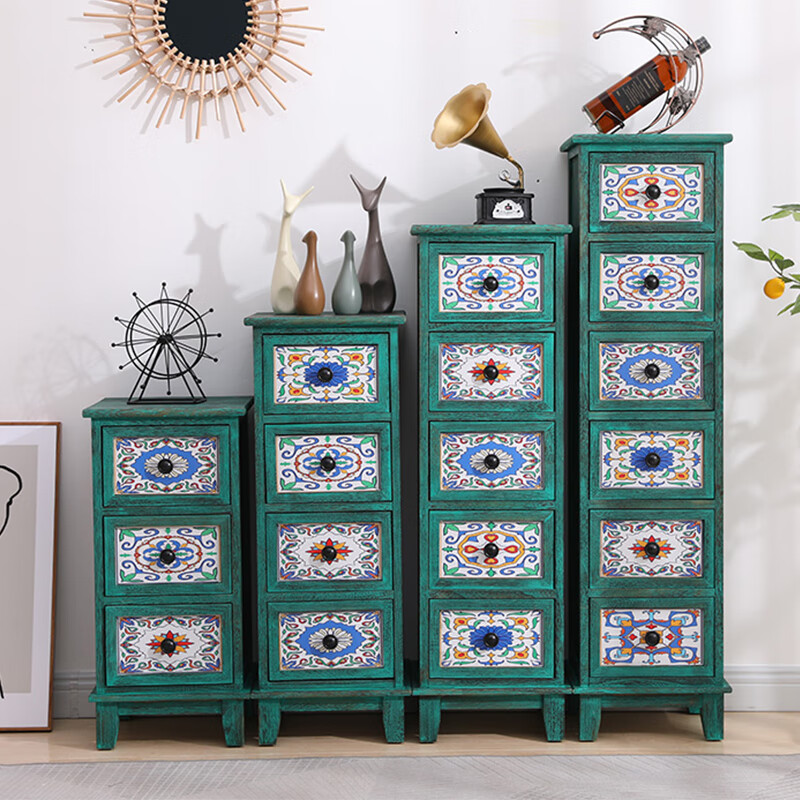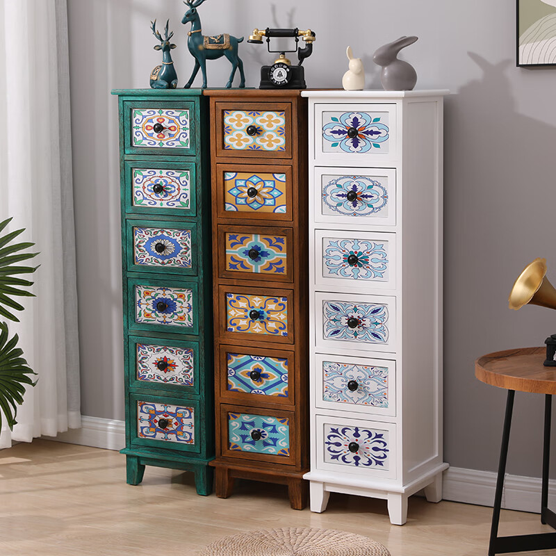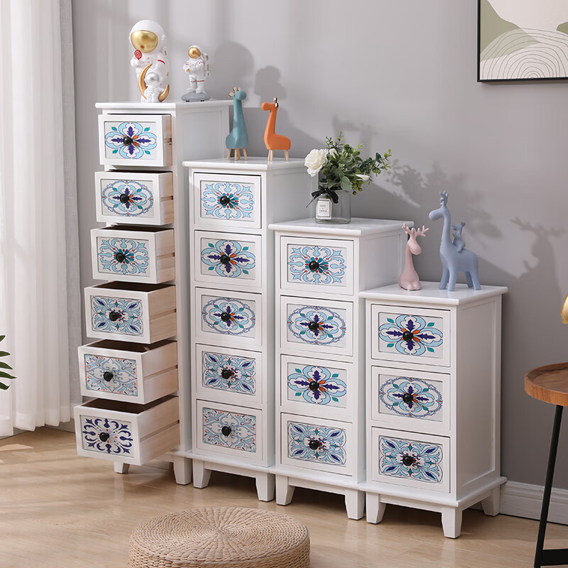 蕾盈加厚实木复古五斗柜夹缝柜简约床头柜抽屉式收纳柜小型30cm窄边柜 花色 象牙白6斗柜彩绘款送桌垫