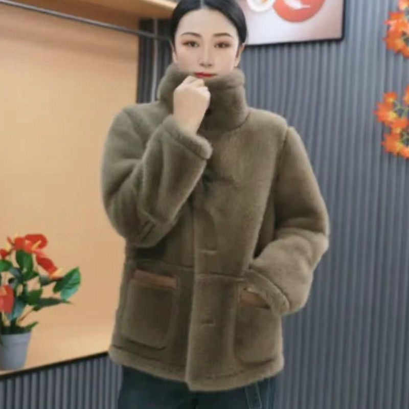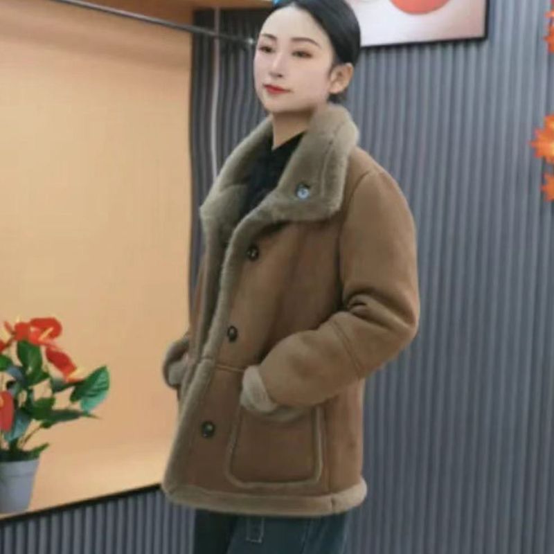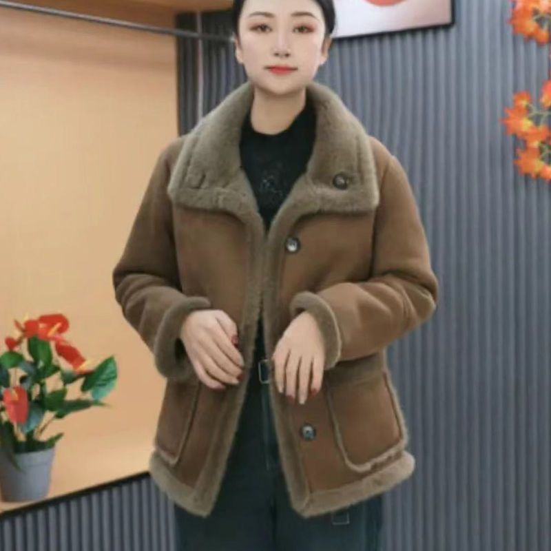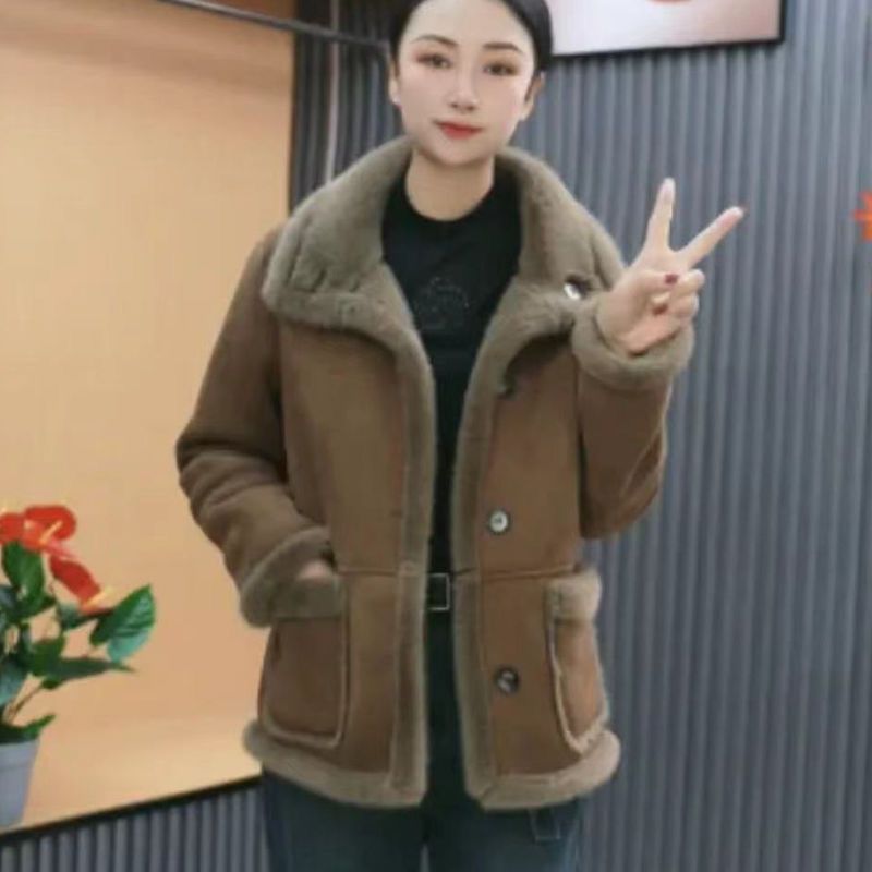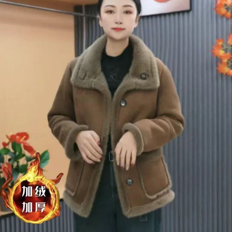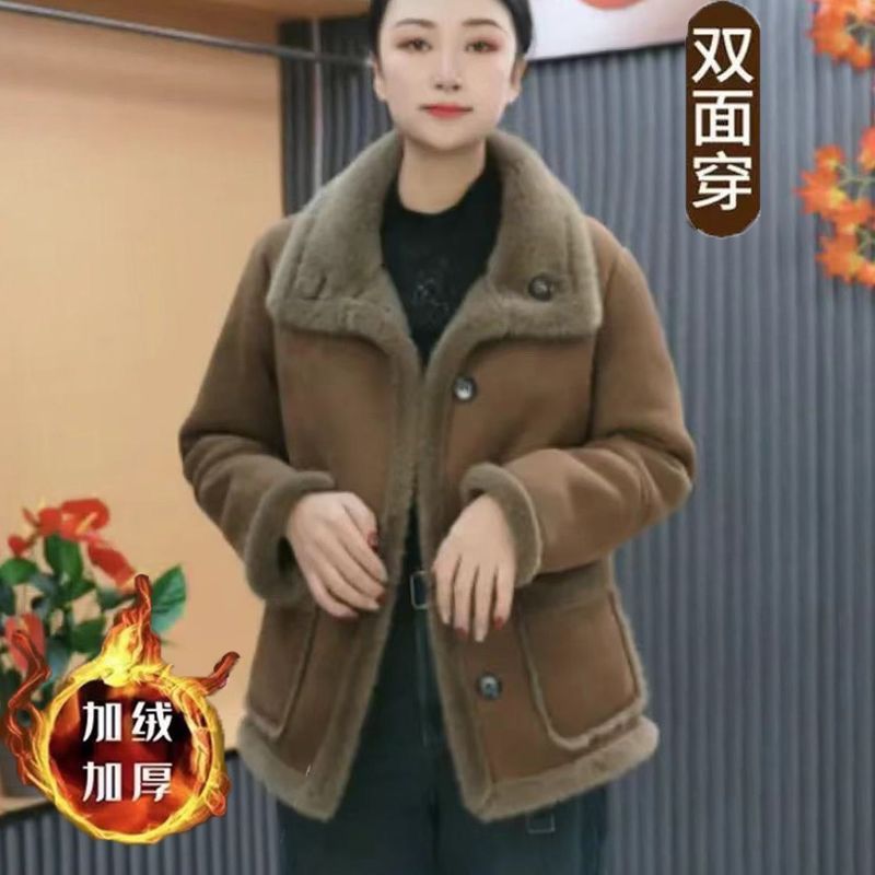 时尚中老年皮毛一体羊羔毛厚外套女冬季新加绒加厚防寒双面穿上衣
