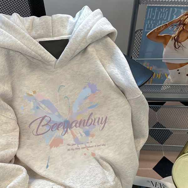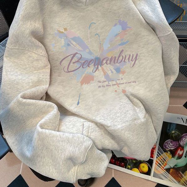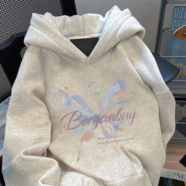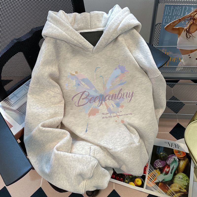 美式潮牌蝴蝶印花连帽卫衣女早秋oversize宽松加绒百搭慵懒风外套