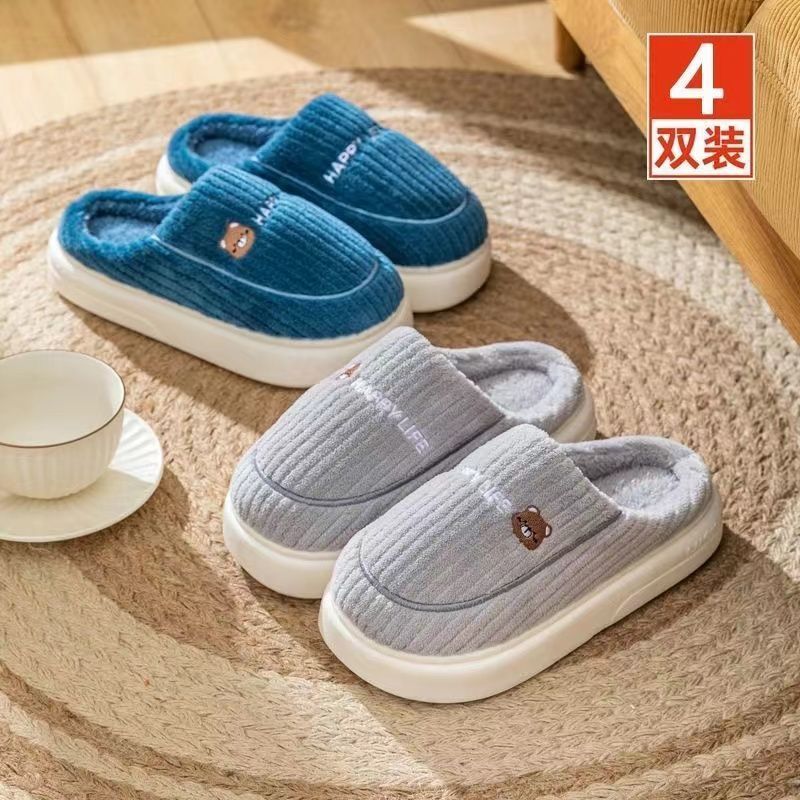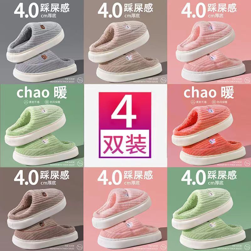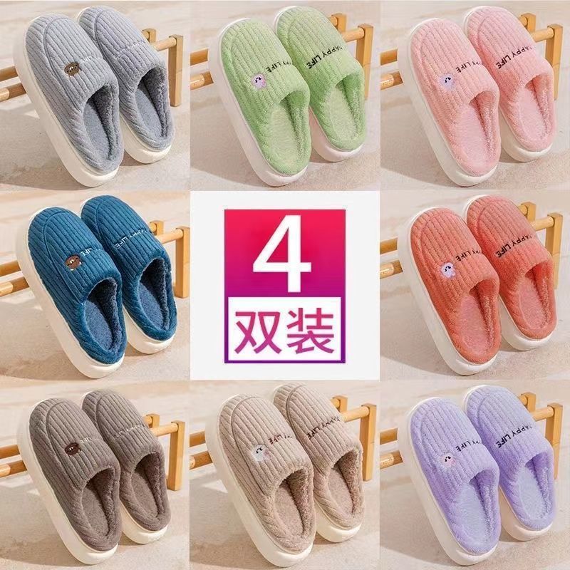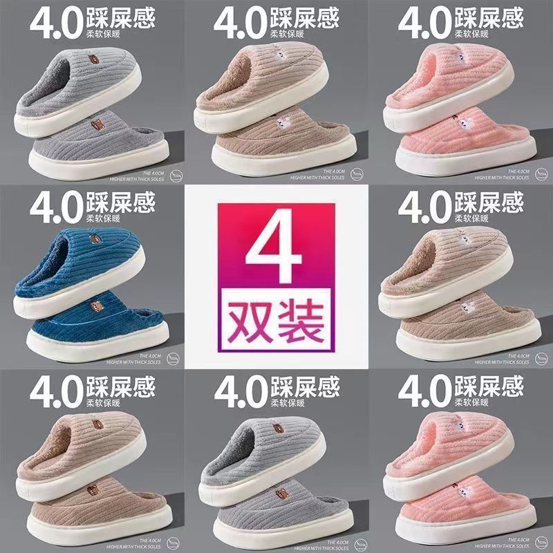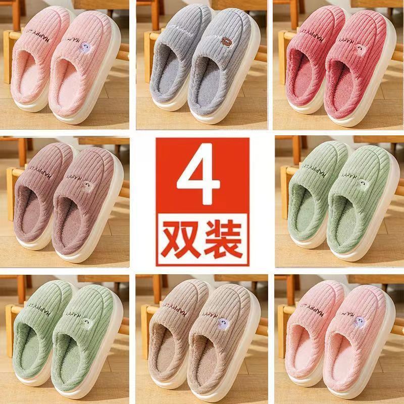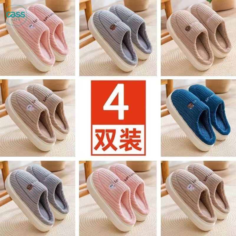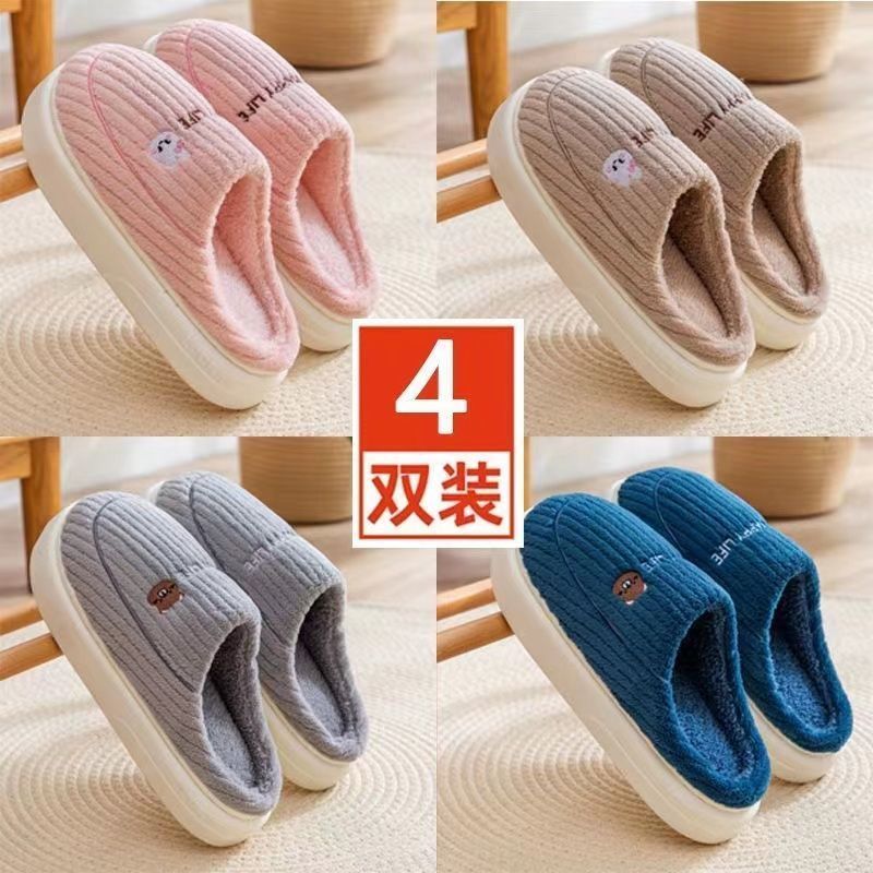 佳适4双棉拖鞋待客拖鞋情侣秋冬毛绒防滑保暖男女室内外穿月子鞋【9天内发货】